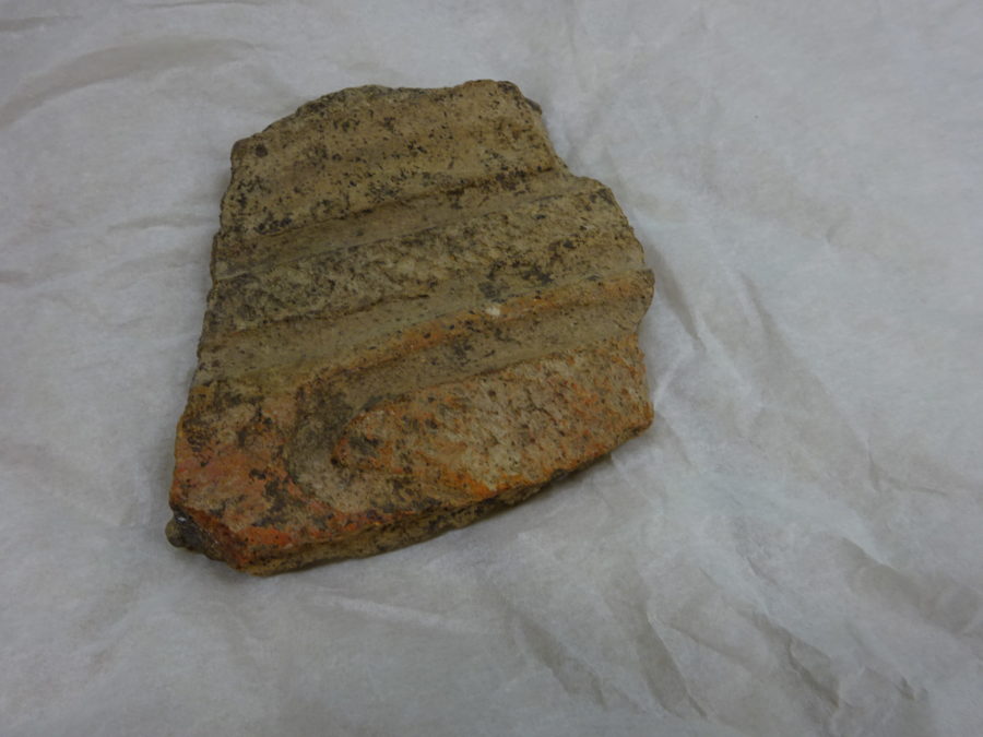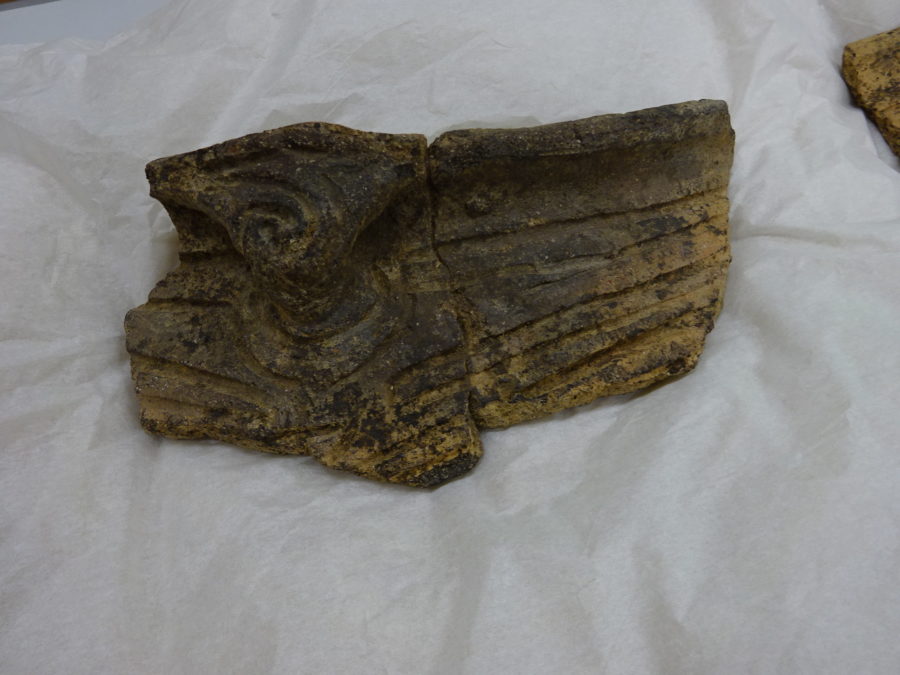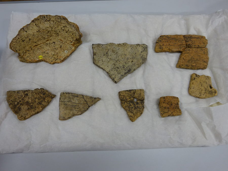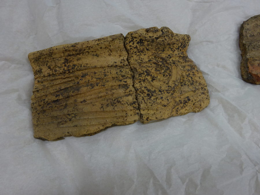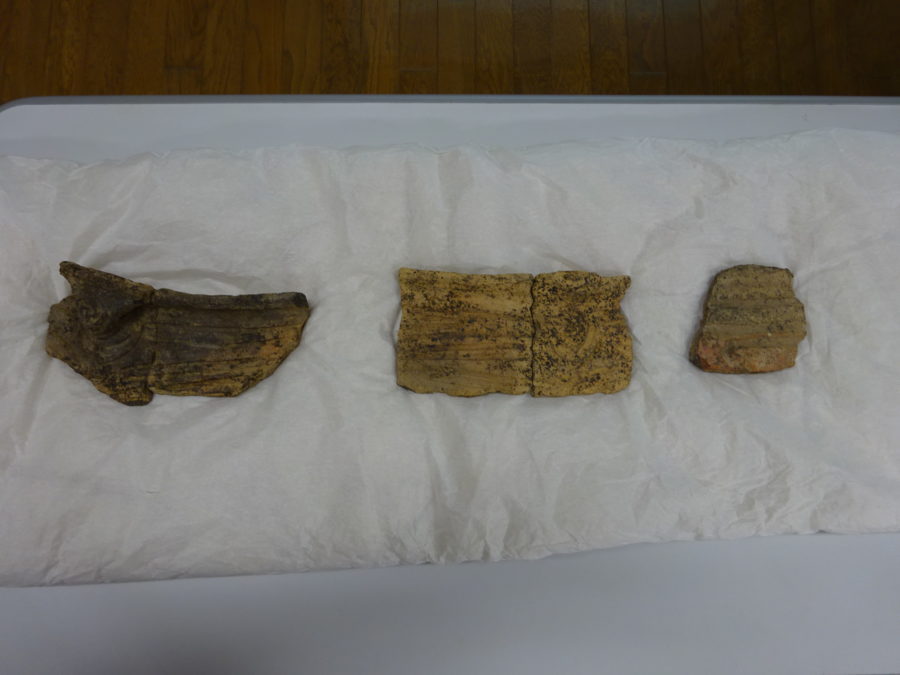 縄文時代後期(およそ4000年~3000年前)の鐘崎式土器の欠片を見ながら、実際に手にとり渦巻き模様の特徴あるものを観察することができました。